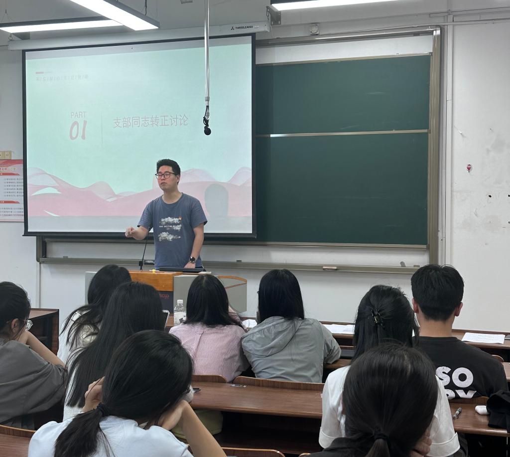 会议伊始,讨论并表决了支部预备党员转正事宜,9位同学成为正式党员,支部书记奚捷捷带领全体支部党员重温入党誓词。