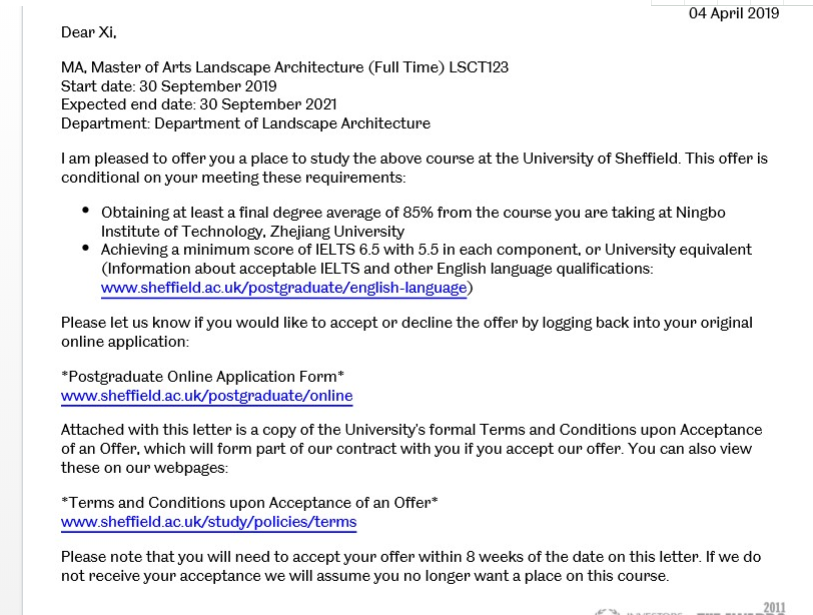 近日,传媒与设计学院2019届环境设计专业毕业生陈曦收到一份景观设计专业全球排名第一的英国院校谢菲尔德的offer。谢菲尔德大学的景观专业在全英享有极高的声誉,陈曦所考取的两年制MA in Landscape Architecture景观建筑研究生更是其中的王牌,华人录取率极低。