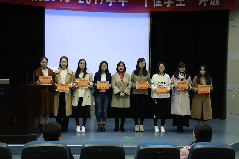 最后,经过评委团的评定,评选出8位同学获得2017年传媒学院“十佳学生”荣誉称号。在全场热烈的掌声中,朱老师为胡佳怡、茅云云、王佳敏、王佳璐、蔡晓婷、周盼佳、林瑶、傅开蕊这八位同学颁发荣誉证书并合影留念。