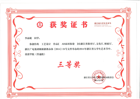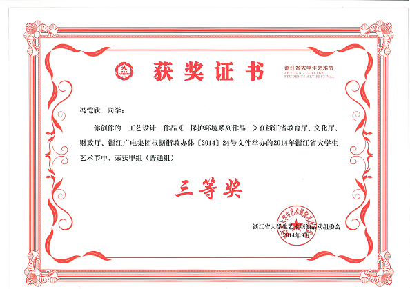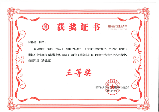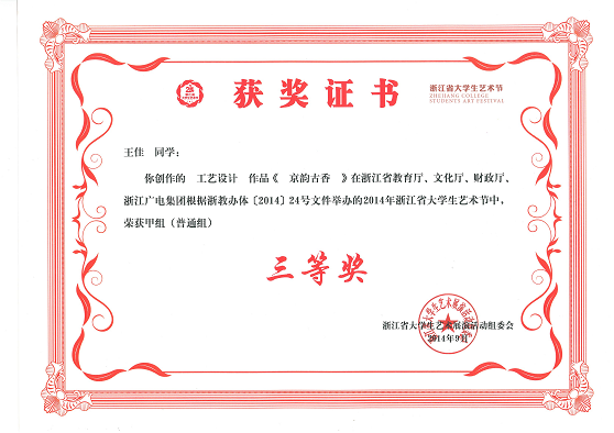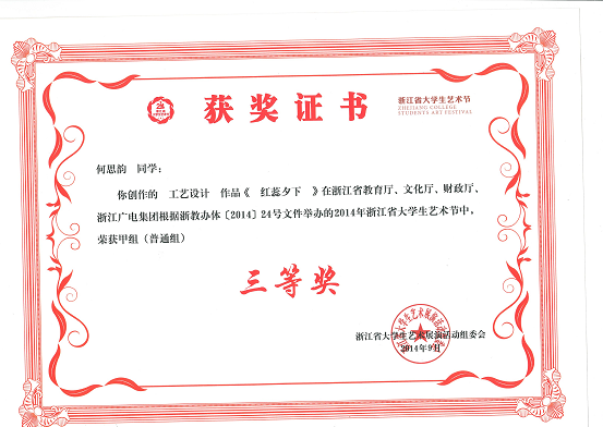 在2014年浙江省大学生艺术节中传媒与设计学院有五件学生作品获得三等奖,作品类型包括摄影、工艺设计等。今后,学院将会选送更多优秀作品参赛,以充分发挥我院的特色优势,展示我院学生的艺术魅力与创意文化。