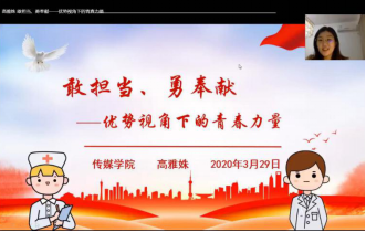 1.心得分享,先锋传递。学生设计党支部教师党员高雅姝老师通过钉钉直播平台,组织开展了《敢担当、勇奉献——优势视角下的青春力量》主题分享会。以学习贯彻“习近平总书记给北京大学援鄂医疗队全体“90后”党员重要回信精神”为切入点,讲授了疫情期间的国之力量与青年之力量,体悟我国的制度优势,引导同学们积极参与分享自身优势,学会运用优势视角挖掘和转化潜能,进一步展现青年担当,践行青年使命。