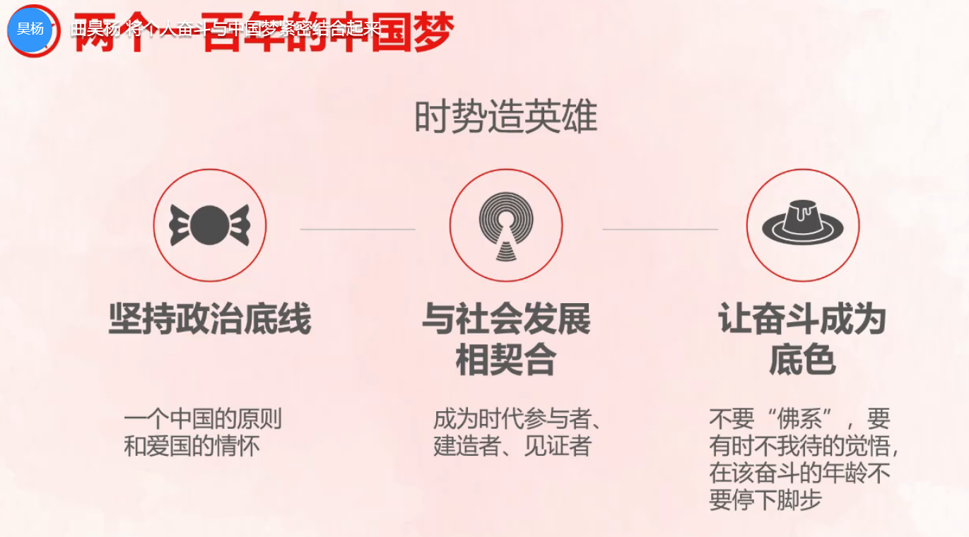 首先,董老师从“青年学生如何成长成才?”和同学们进行了线上互动,同学们也积极的从自身实际情况给予了响应“学习与社会实践并重”、“克服拖延症”、“做好计划和自我管理”、“早睡早起好好学习”、“不忘初心,脚踏实地”等等。此后,董老师从“厚积德行,立德修身”,“厚积志趣,笃志笃行”,“厚积学识,博学近思”,“厚积能力,知行合一”四个方面展开讲述,劝勉青年学生要把修德放在个人修养的首要位置,同时做有理想的青年、有本领的青年、有担当的青年。