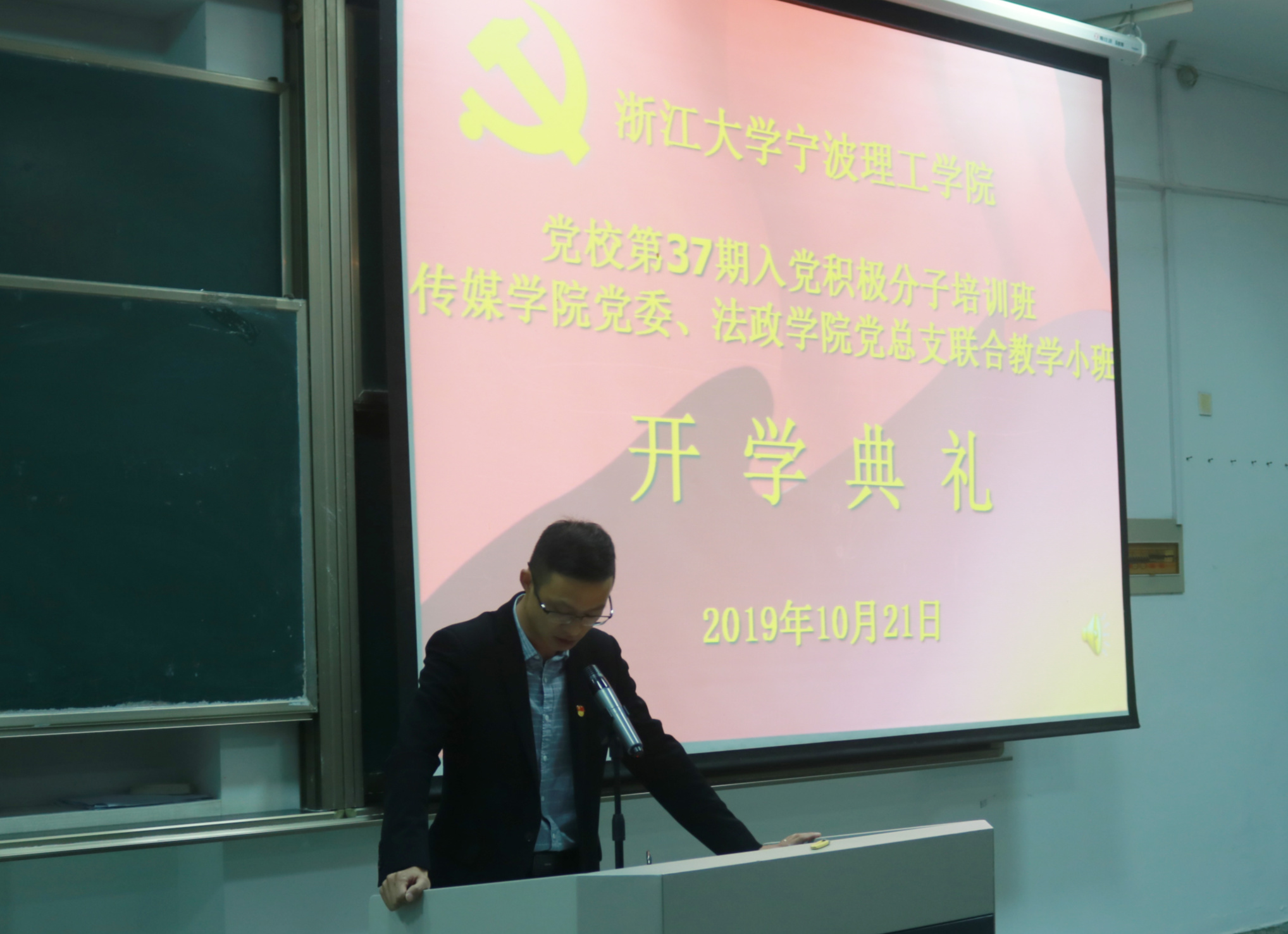 传媒学院党委副书记胡鹿鸣作党校第一讲暨动员讲话,胡老师指出,在全国上下深入学习党的十九大精神、大力开展“不忘初心、牢记使命”主题教育,纪念五四运动100周年、欢庆伟大祖国成立七十周年之际,在我们浙江大学宁波理工学院迎来18周岁生日,迎接教育部转设专家组评估、努力朝着“省内一流、全国百强”的高水平应用型大学建设大步迈进的历史性发展时刻,代表学院党委、党总支对全体学员进入入党积极分子党校学习表示欢迎与祝贺,对这些渴望进步、追求卓越的同学们提出新希望、新要求。胡老师与学员们谈到三个方面问题:第一、端正态度,珍惜党校学习的大好机会。强调党校是入党积极分子学习和实践党的基本理论知识的重要场合、是端正入党动机和提高思想政治觉悟的重要途径、是落实党中央关于党员发展工作指示精神的需要,因此学员们首先要端正态度、珍惜学习机会。第二、认真学习,深入理解和掌握党校学习的主要内容;第三、亮明身份,做出入党积极分子表率。最后,全场师生起立奏唱《国际歌》,在昂扬的歌声中典礼各项议程落下帷幕。