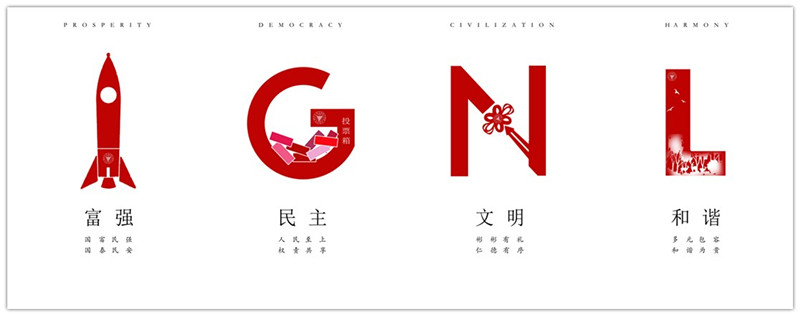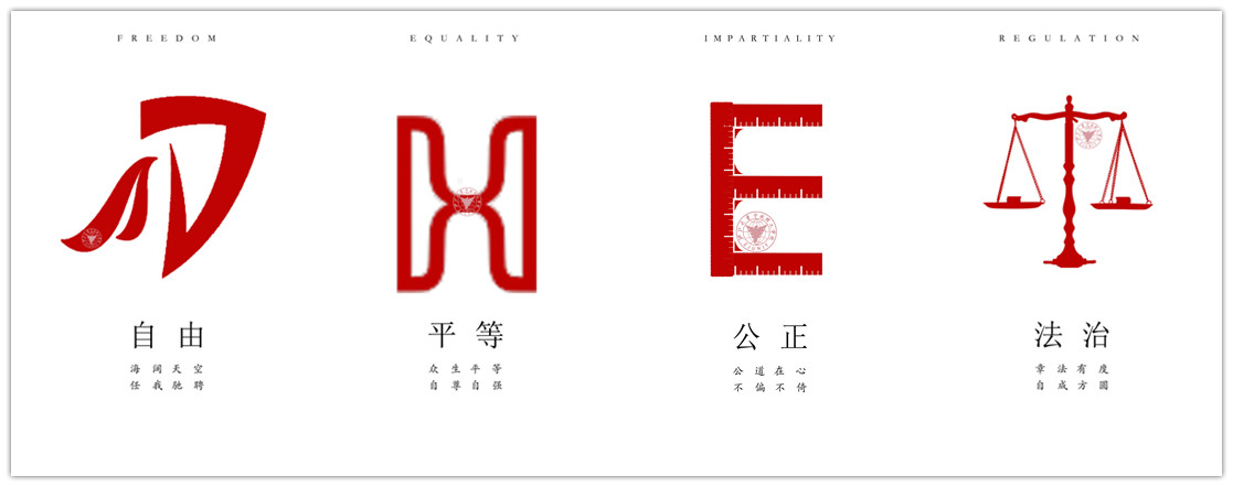 在这组设计中,“爱国”以纪念碑为元素,“敬业”以奔跑为元素,“诚信”以握手为元素,“友善”以笑脸为元素,“自由”以翅膀为元素,“平等”以对称为元素, “公正”以尺子为元素,“法治”以天平为元素, “富强”以火箭为元素,“民主”以投票箱为元素,“文明”以中国结为元素,“和谐”以自然为元素,表达了支部党员对社会主义核心价值观的用心理解以及爱党爱国、感恩学校的朴素情感。