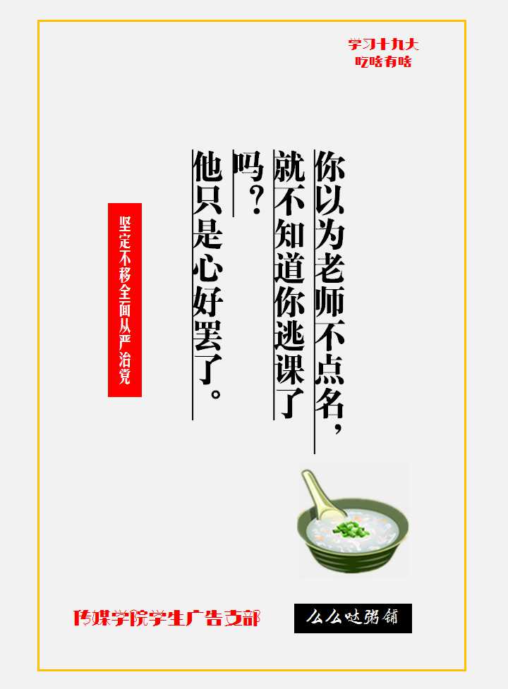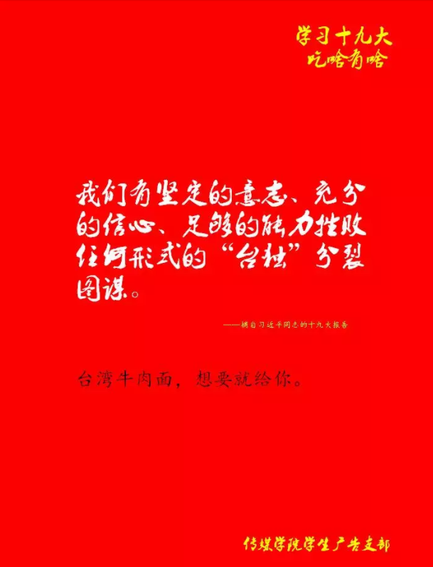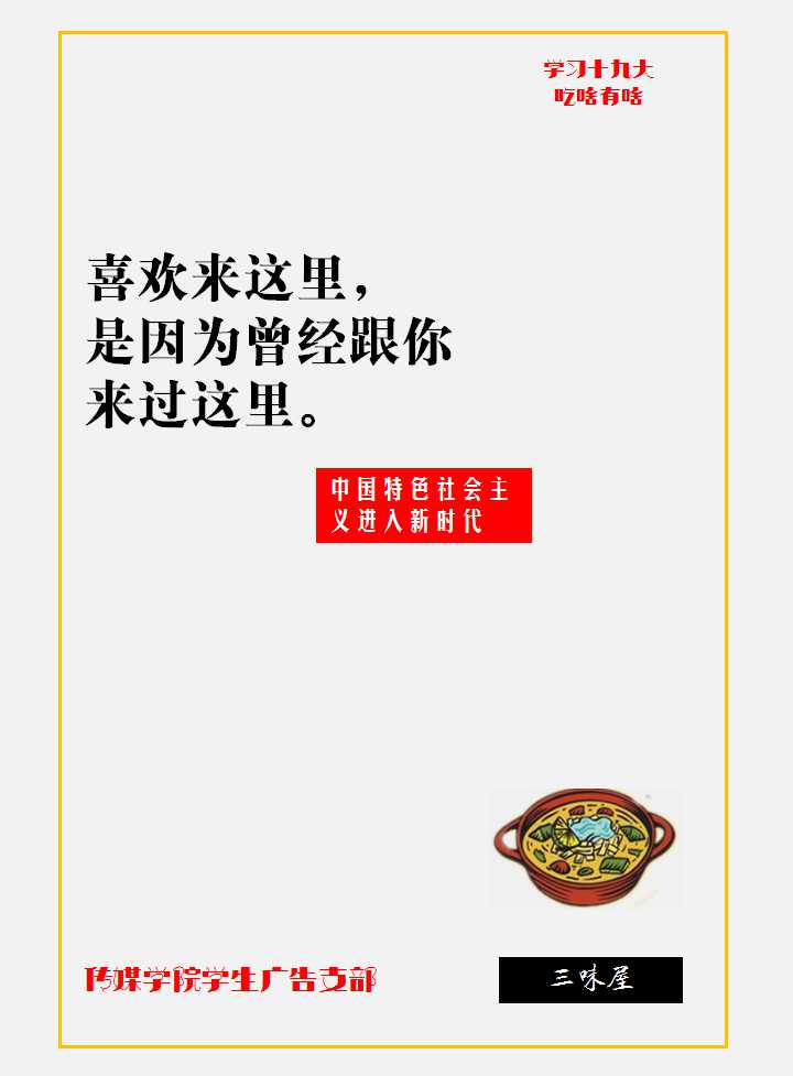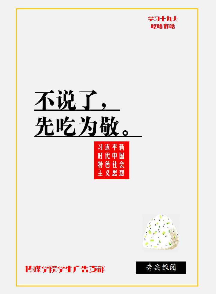 近日,传媒学院学生广告支部学生党员根据自己的专业知识和才能创作了一批“学习十九大,吃啥有啥”活动海报。
