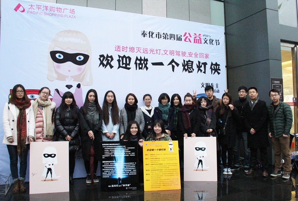 2015年12月5日,浙江大学宁波理工学院传媒与设计党总支的党员志愿者们前往位于宁波奉化市的太平洋购物广场宣传“欢迎做个熄灯侠——倡导文明驾驶,适时熄灭远光灯”活动。