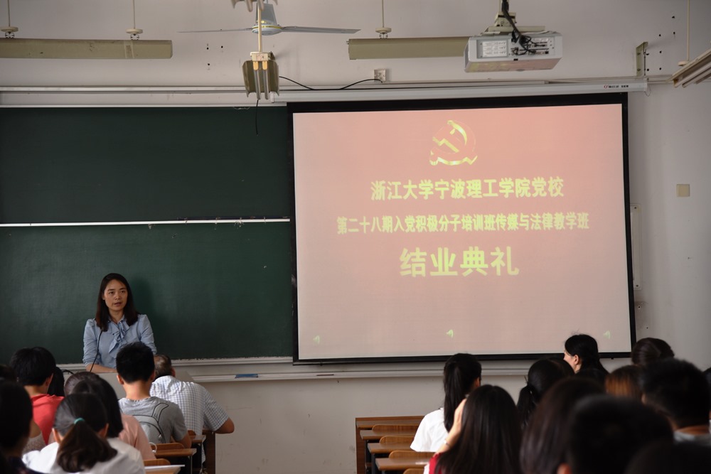 6月11日日中午12点30分,浙江大学宁波理工学院党校第二十八期入党积极分子培训班传媒与法律教学班结业典礼在SC304隆重举行。兼职组织员王坚毅老师出席,思政主管任凯老师主持会议,全体辅导员及学院参加会议。