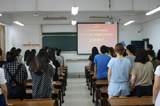 典礼在国歌中拉开序幕。接着由此次党校班主任赵红老师对本期党课培训班情况作了总结。此次培训共有61位学员,自4月16日开班以来,经过理论课、电教片观摩、时间讨论、结业考试等环节,共有51名学员顺利毕业,其中有6名被评为优秀学员。接着赵红老师宣读了优秀学员名单。优秀学员代表网新131班徐子晴做了《坚定信念,勇往直前》的主题发言。最后,任凯老师进行了讲话,希望大家脚踏实地,不断学习,提高党性修养,以实际行动争取早日加入党组织,成为一名优秀的共产党员。