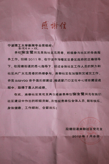 新学期伊始,我校新闻专业党支部收到了一封来自宁波市段塘街道南都社区党总支的感谢信。信中对我校的徐汝莹同学在2011年的社区志愿者活动中突出的成绩进行了肯定以及表扬。