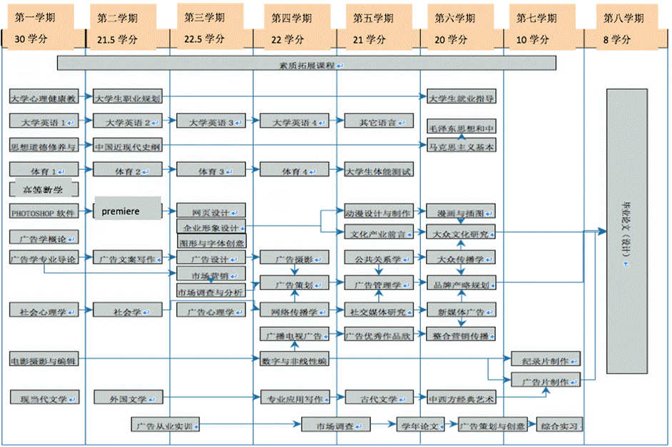 广告学概论、广告学专业导论、广告心理学、社会心理学、传播学概论、广告策划、广告设计、广告文案写作、广告管理学、广告美学、广告优秀作品欣赏、新媒体广告、市场营销、中国现当代文学、市场调查与分析、广告摄影、企业形象设计、电视摄影与编辑、美术基础(素描与色彩)(A)等。